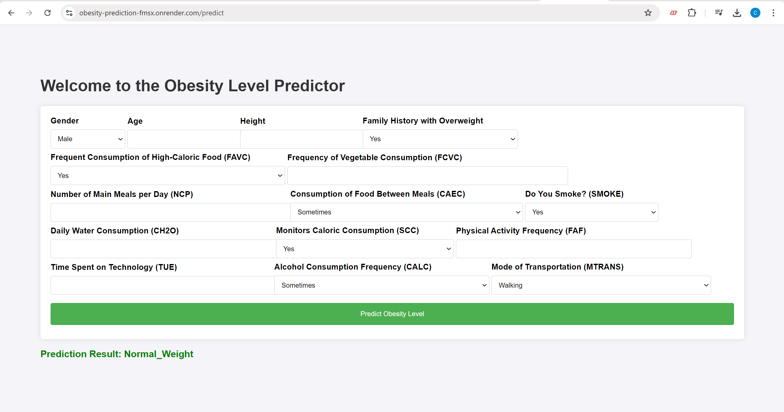 This MLOps project predicts obesity levels using a Random Forest model with scikit-learn, managed by DVC for pipeline automation. The app is deployed on Render Cloud with FastAPI for user interaction.